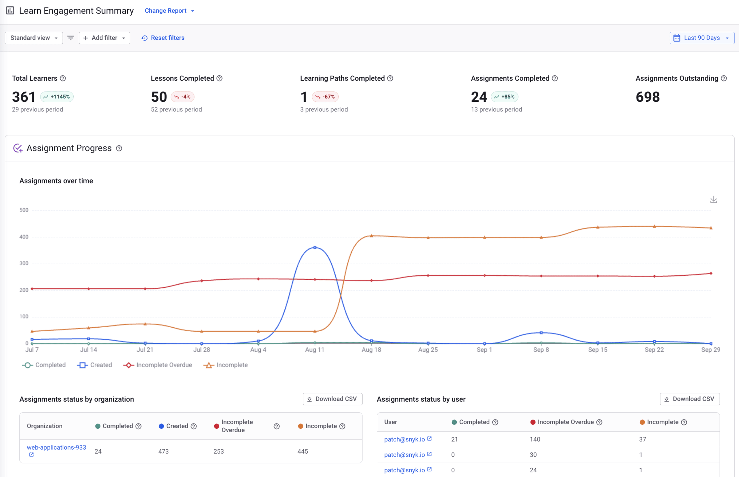 This report provides valuable insights into user adoption of Snyk Learn, including the ability to track and report on assignment progress.